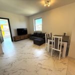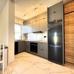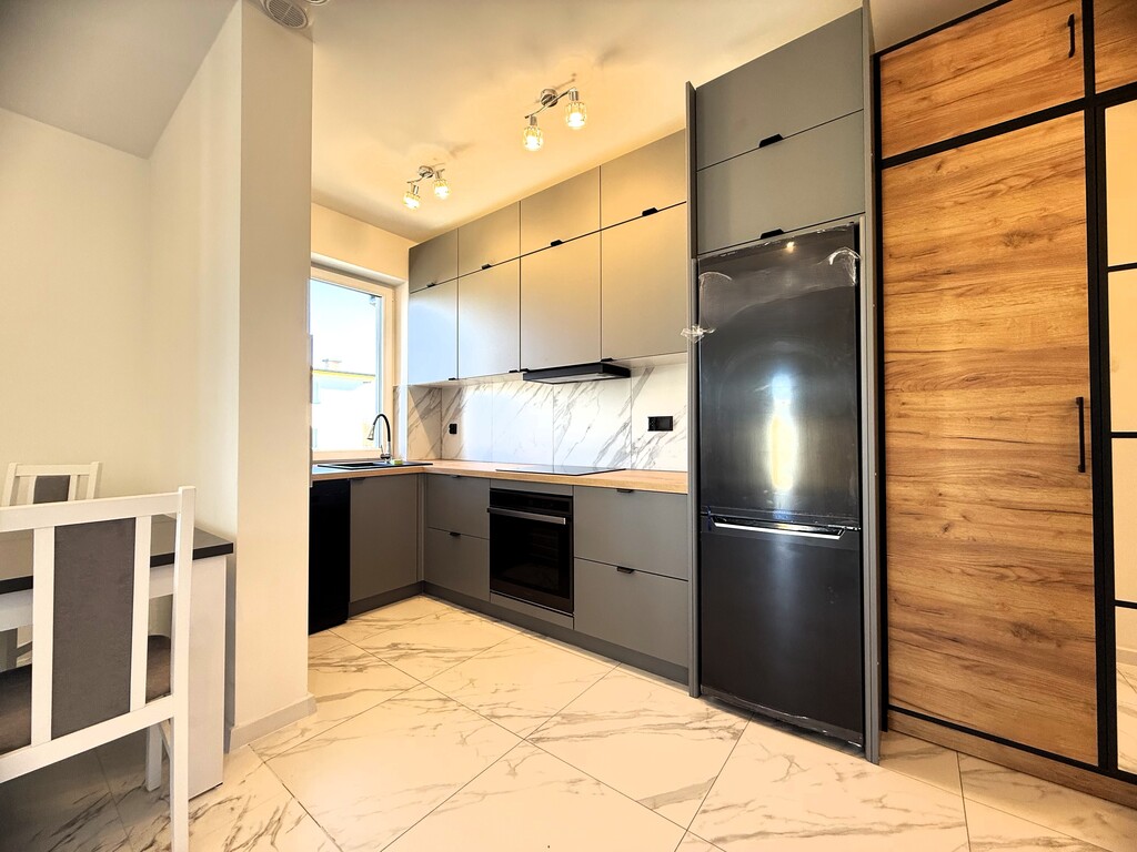 - Salon z aneksem kuchennym – urządzony w spójnej, nowoczesnej stylistyce. Aneks wyposażony w pełną zabudowę meblową oraz sprzęt AGD: lodówkę, płytę grzewczą, piekarnik. Część dzienna z wygodną kanapą oraz stołem jadalnianym tworzy idealne miejsce do relaksu i spotkań.