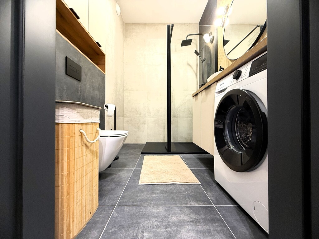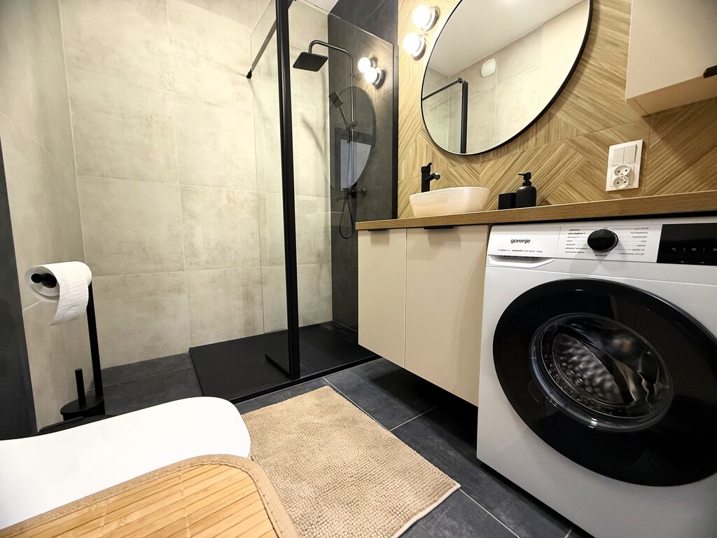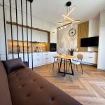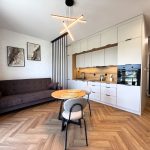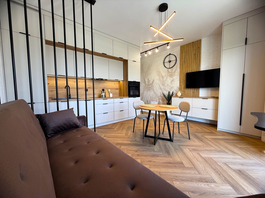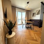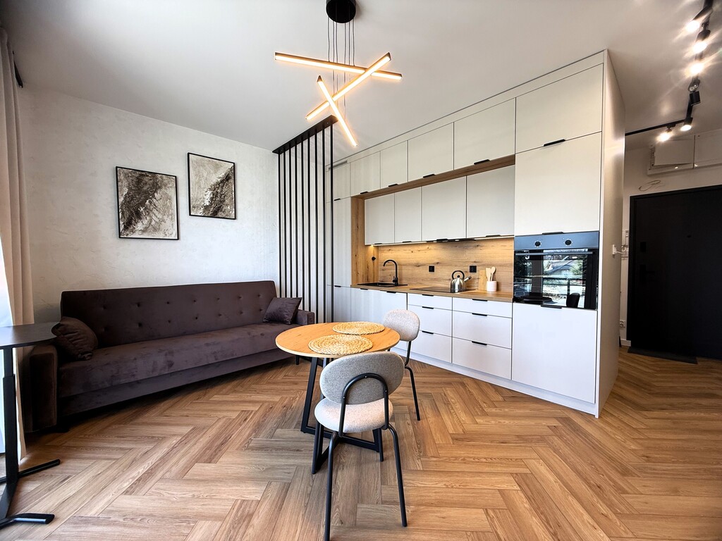 Nieruchomość wyposażona w: meble w zabudowie kuchennej, lodówkę, zmywarkę, płytę indukcyjną, okap, zlewozmywak, garnki, czajnik, TV, kanapę z funkcją spania, pojemną szafę, pralkę. Wszystkie sprzęty AGD i wyposażenie mieszkania są nowe.