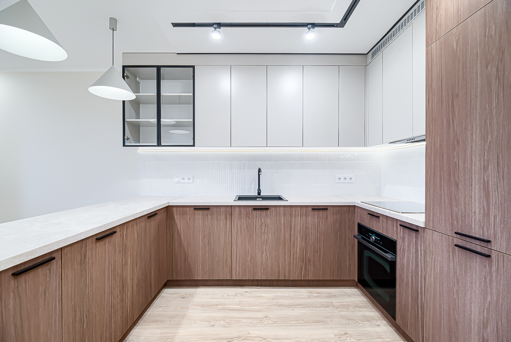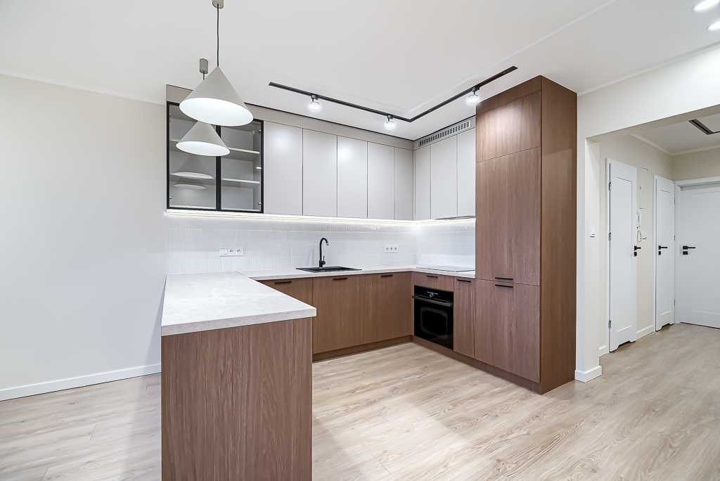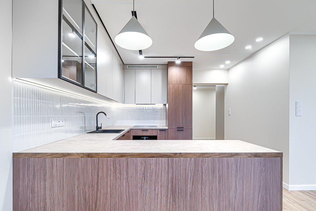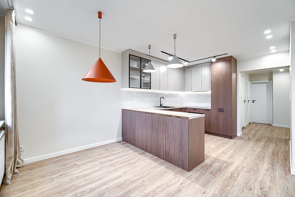 • Nowoczesna kuchnia w zabudowie z pełnym wyposażeniem AGD (płyta indukcyjna, piekarnik, lodówka, zmywarka, okap)