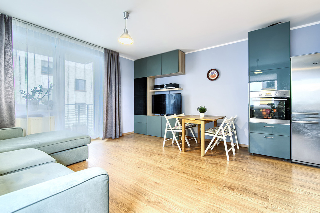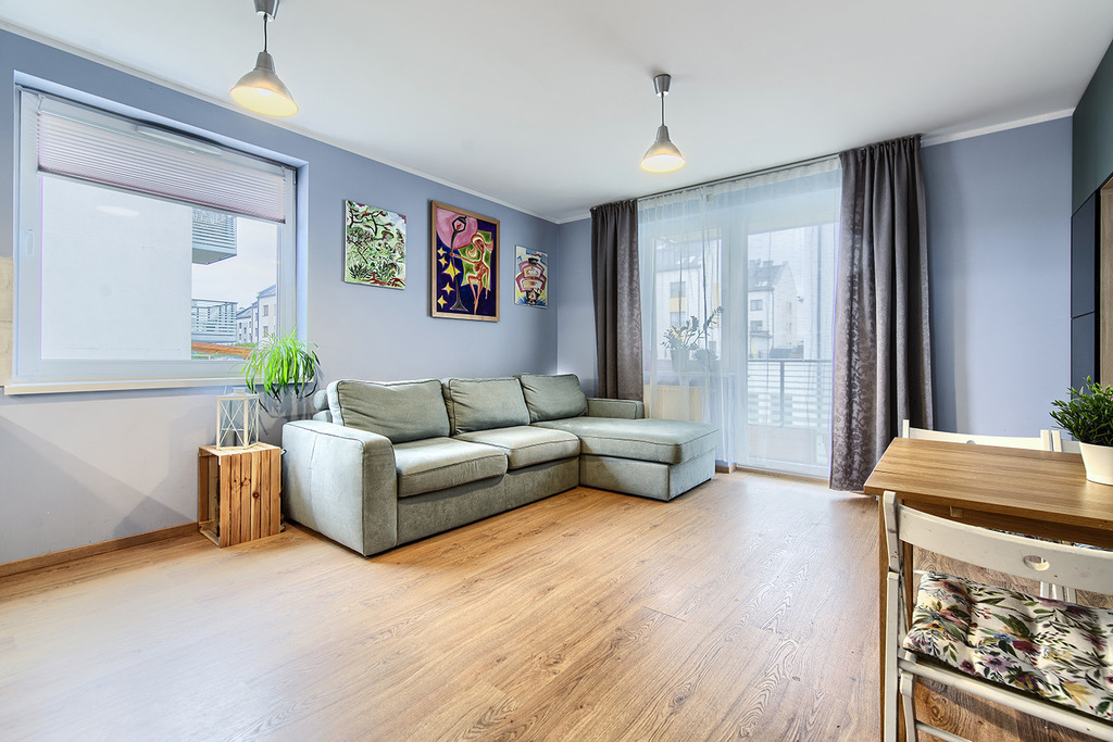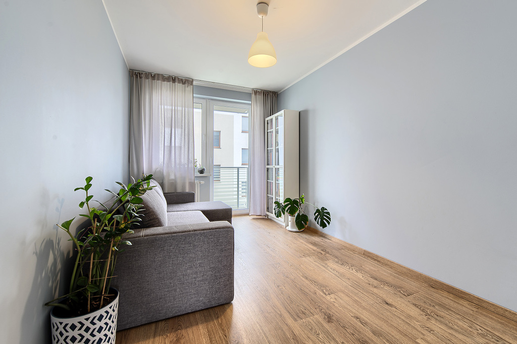 - przestronnego salonu z aneksem kuchennym z wyjściem na balkon (24m2 + 3,7m2)