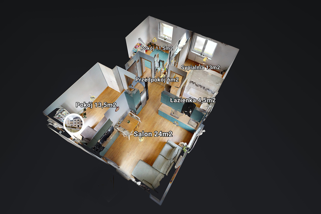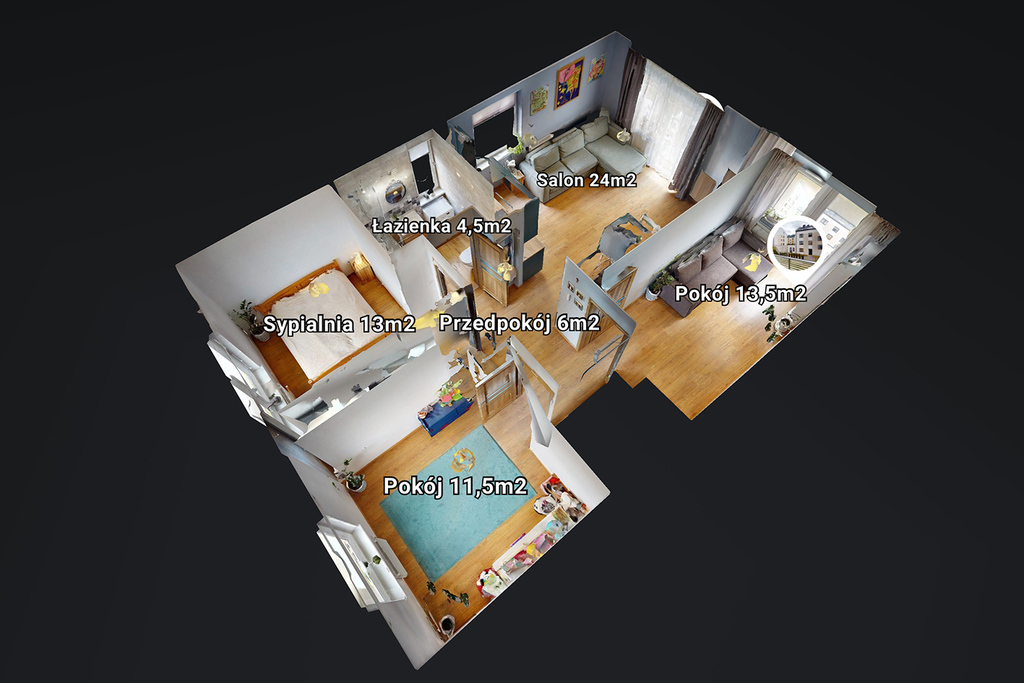 - pokoju z wyjściem na balkon (13,5m2 + 3,7m2)