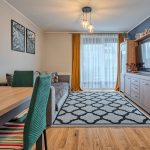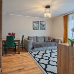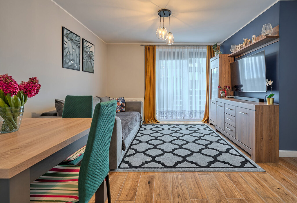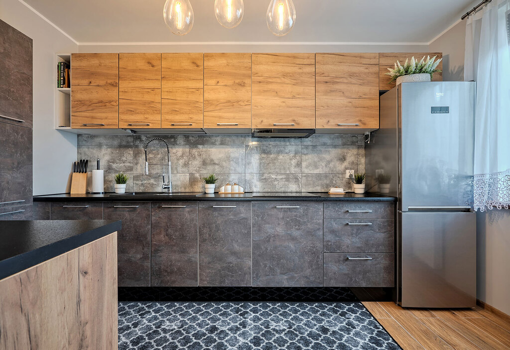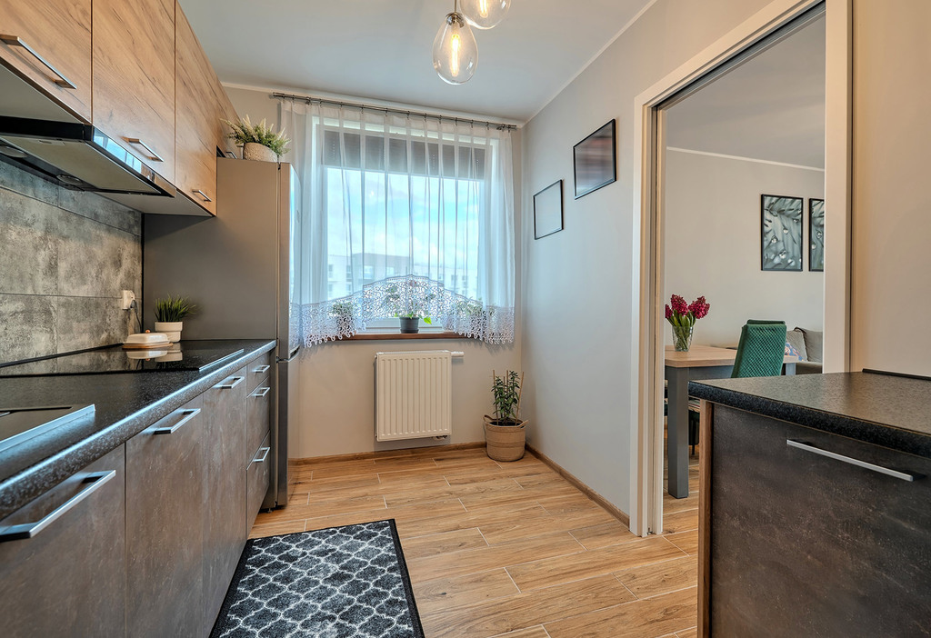 * Kuchnia została wyposażona w nowoczesne meble oraz sprzęty AGD najwyższej jakości, w tym lodówkę, piekarnik, płytę indukcyjną oraz okap.