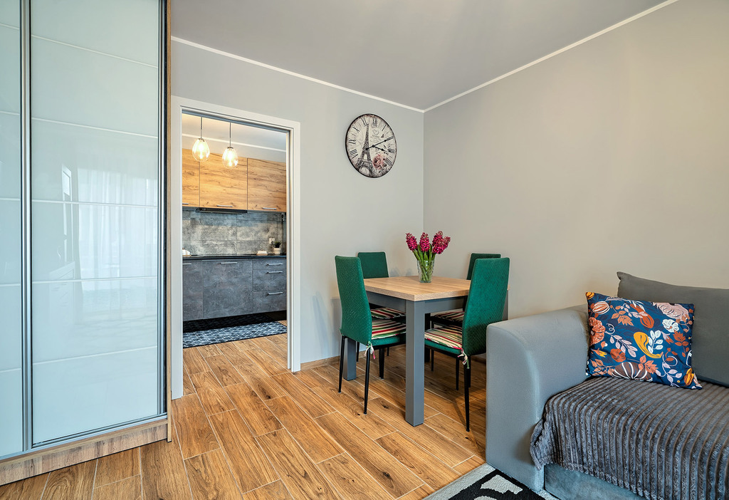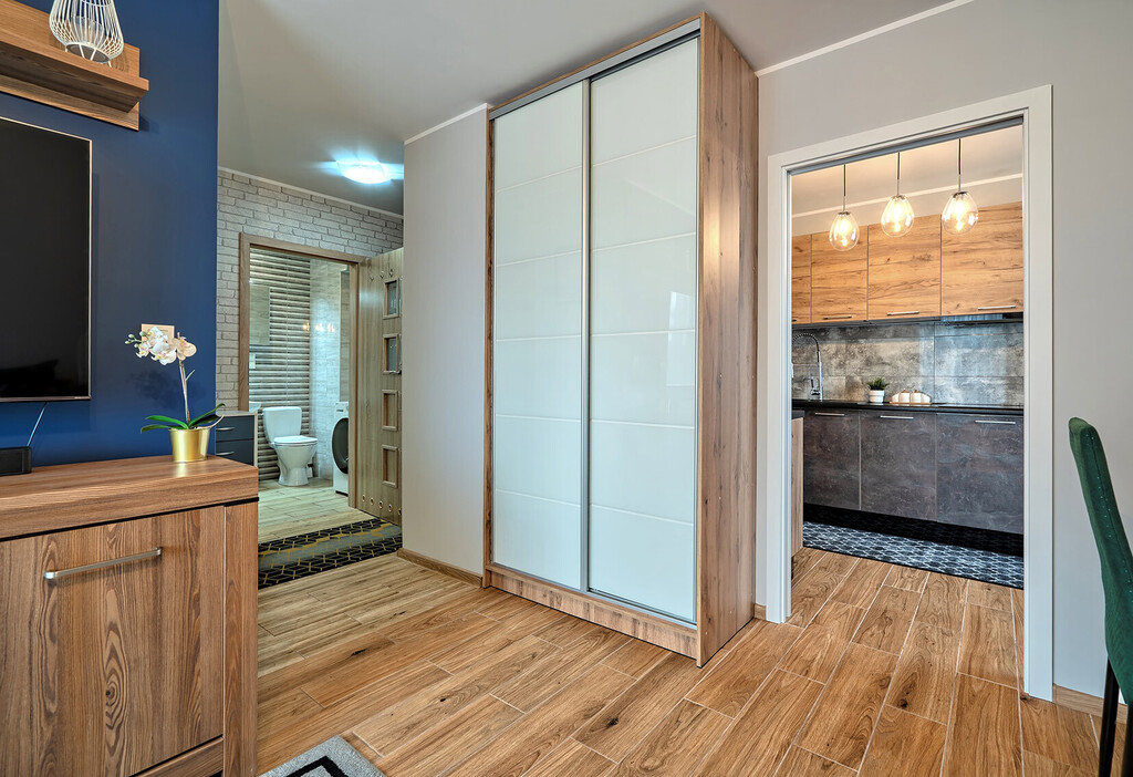 Osobna kuchnia, wydzielona ścianką działową oddzielającą ją od salonu – istnieje możliwość łatwego demontażu ściany i powrotu do pierwotnego układu z aneksem kuchennym połączonym z salonem