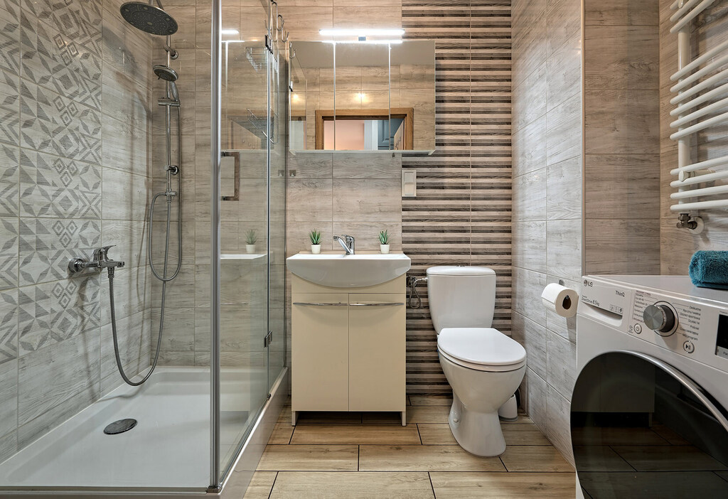 * Łazienka wyposażona jest w wygodny prysznic, umywalkę, WC, miejscem na pralkę oraz suszarkę