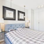 Sypialnia posiada wygodne łóżko oraz zabudowaną szafę i telewizor.
