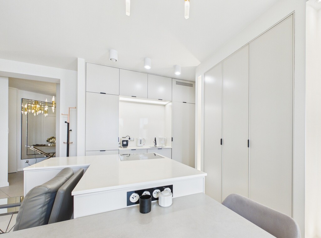 Kuchnia zabudowana jest nowoczesnymi szafkami i wyposażona w lodówkę z zamrażarką, pralkę, zmywarkę oraz wyspę z płytą indukcyjną i piekarnikiem.