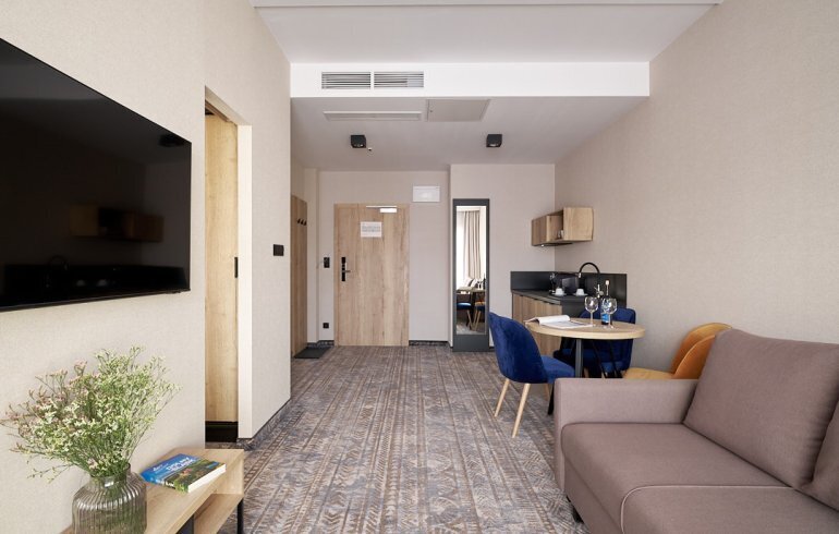 • Apartament składa się z przestronnego salonu z rozkładaną sofą oraz aneksu kuchennego, wyposażony w niezbędne akcesoria.
