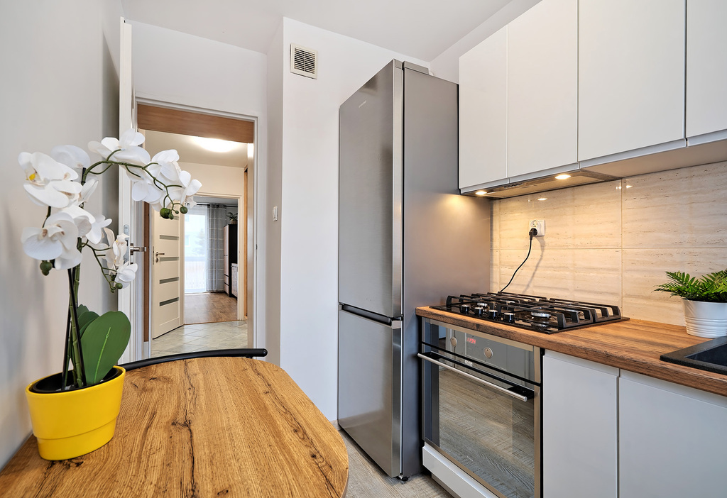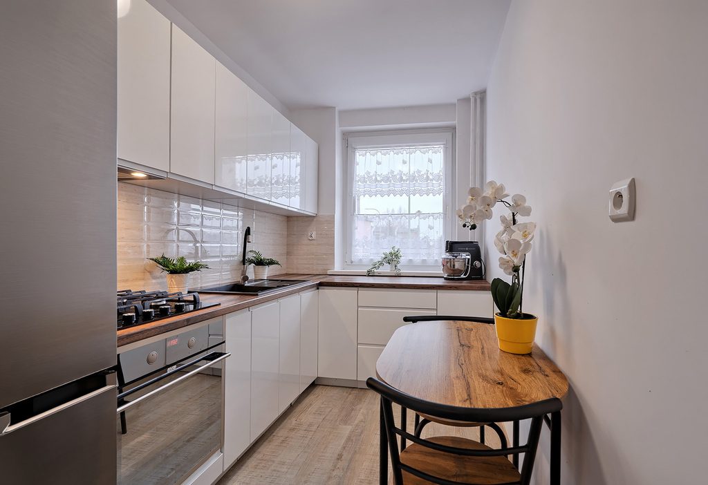 • Kuchnia: osobna, w pełni zabudowana, wyposażona w sprzęt AGD (lodówka, piekarnik, płyta gazowa, okap)