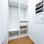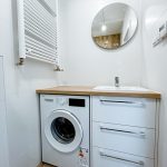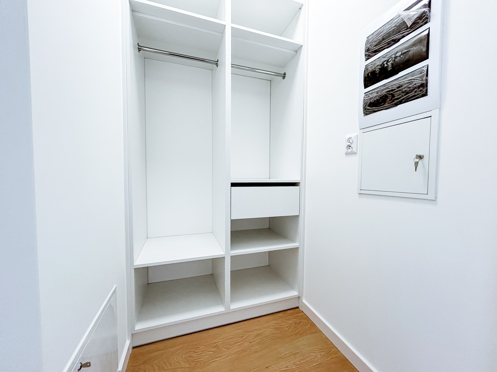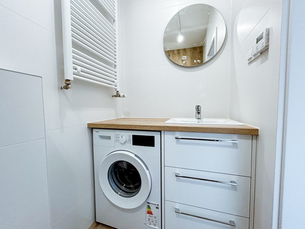 Kuchnia wyposażona jest w meble w zabudowie oraz sprzęt AGD. W łazience znajduje się pralka. W salonie znajduje się szafka RTV, a w garderobie wykonano praktyczną zabudowę meblową zapewniającą dużo miejsca do przechowywania.