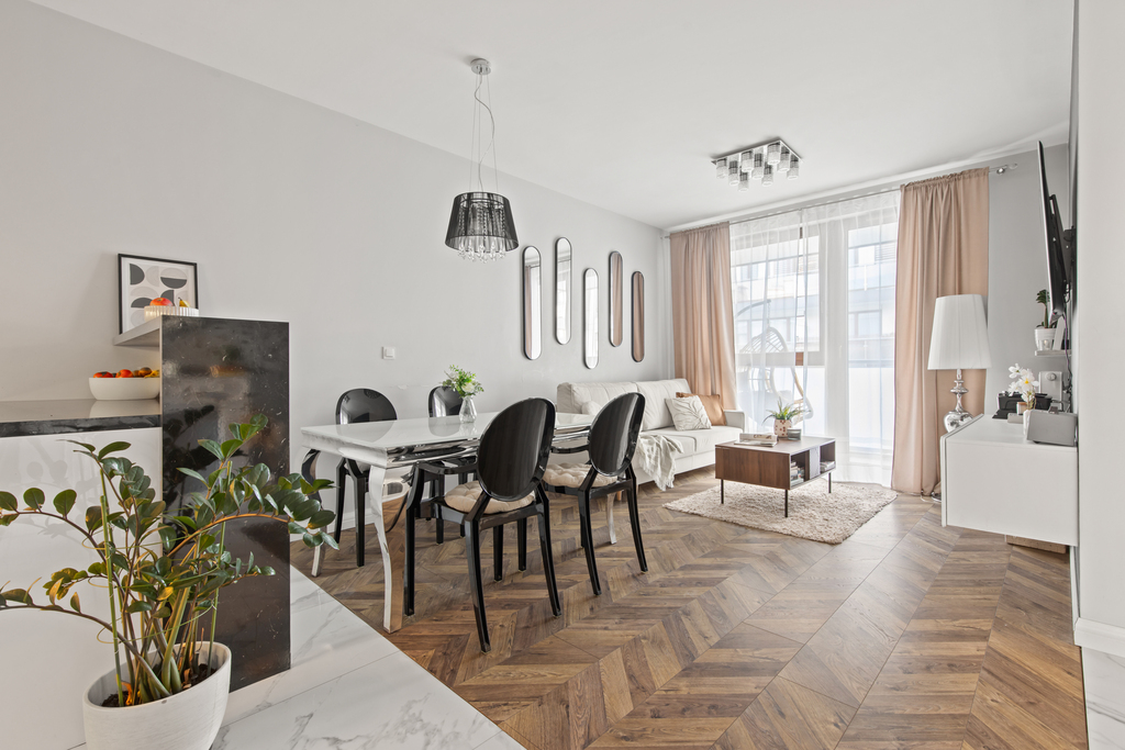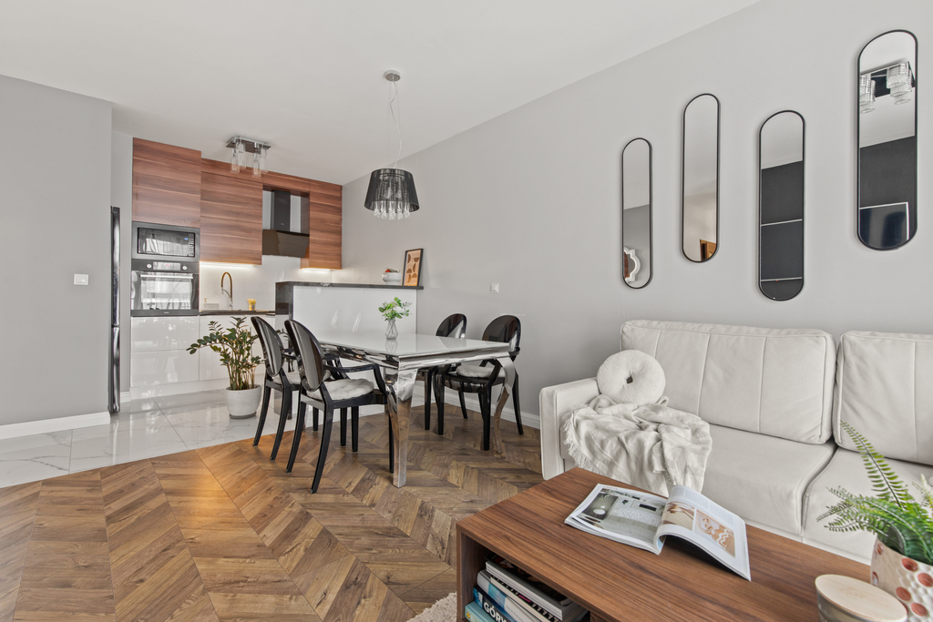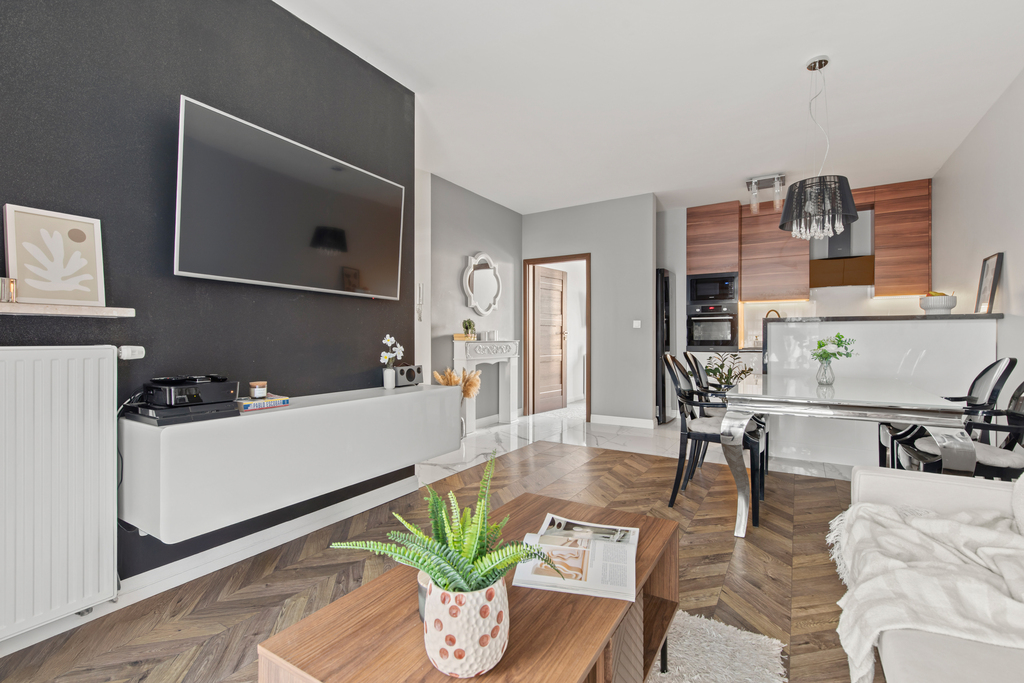 Mieszkanie jest funkcjonalne i wygodne w codziennym użytkowaniu, z wyraźnym podziałem na strefę dzienną i prywatną.
