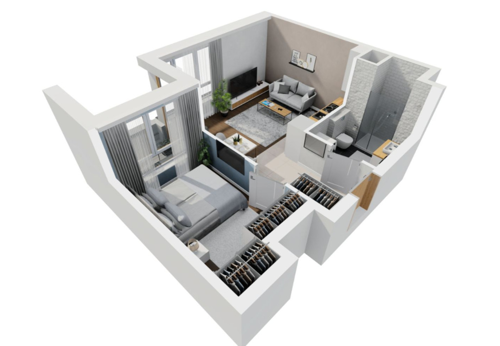 Przedstawione wizualizacje i grafiki mają charakter wyłącznie poglądowy i stanowią wyłącznie materiał pomocniczy, ułatwiający zorientowanie się w ogólnym wyglądzie oferowanej nieruchomości.