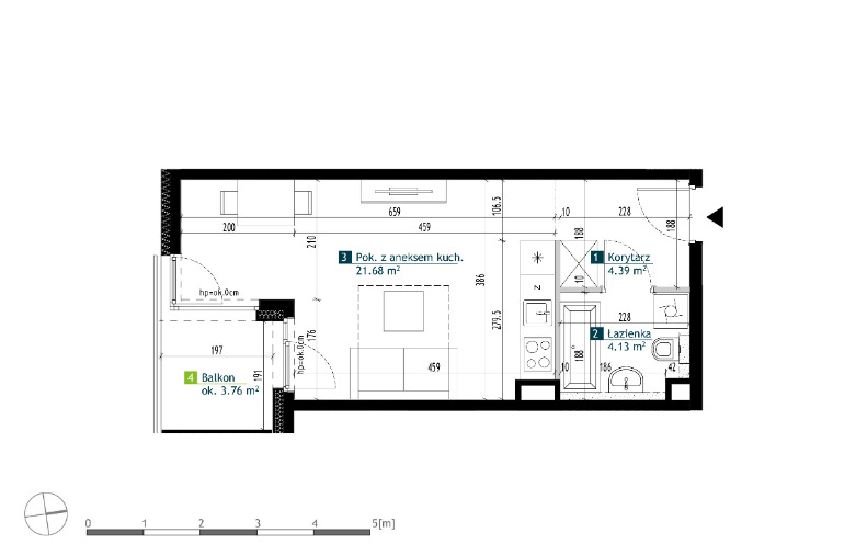- Salon z aneksem kuchennym 21,68 m2