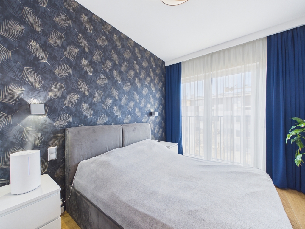 - Sypialnia (12,44 m²) – komfortowa, dobrze doświetlona, z pojemnymi szafami na wymiar.
