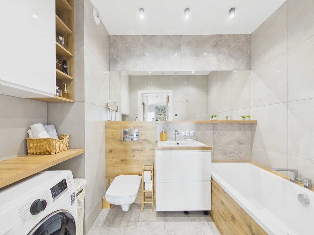 - Łazienka (4,54 m²) – dobrze zaprojektowana przestrzeń z wygodną wanną, ogrzewaniem podłogowym, radiem i głośnikami w suficie.
