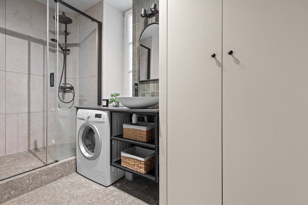 • Łazienka z prysznicem oraz zabudową gospodarczą