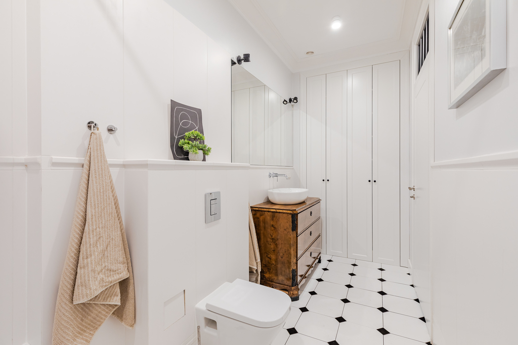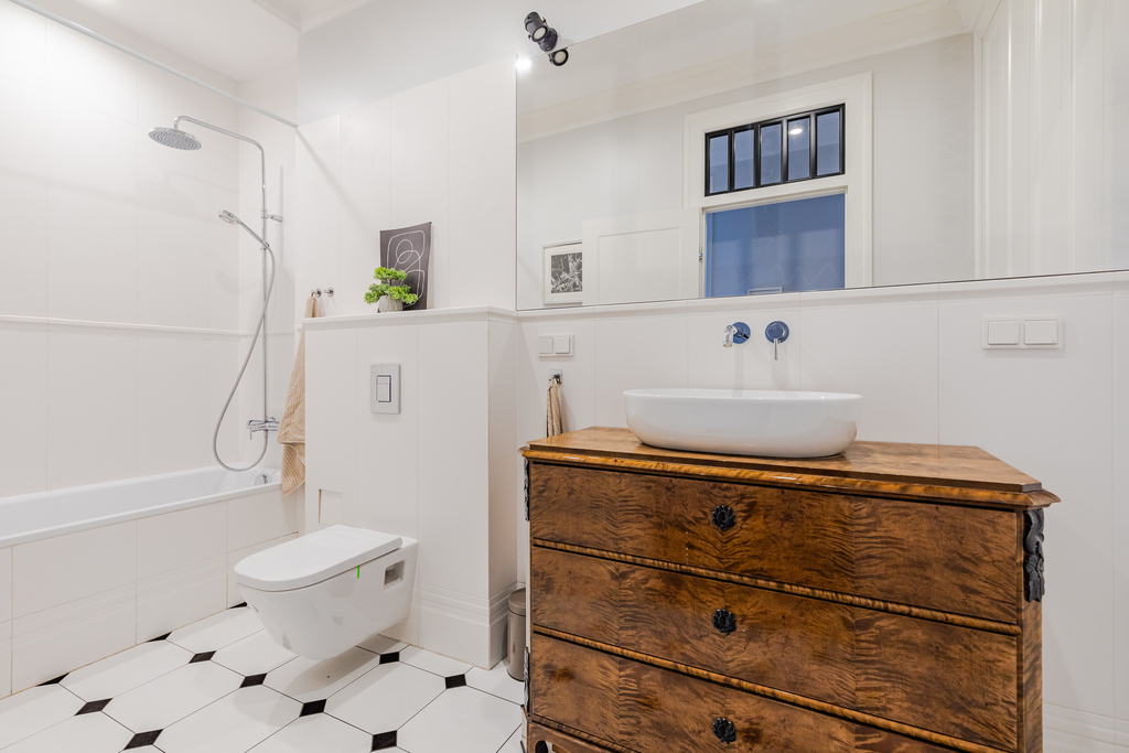 Bathroom with bathtub and shower, functional wardrobes