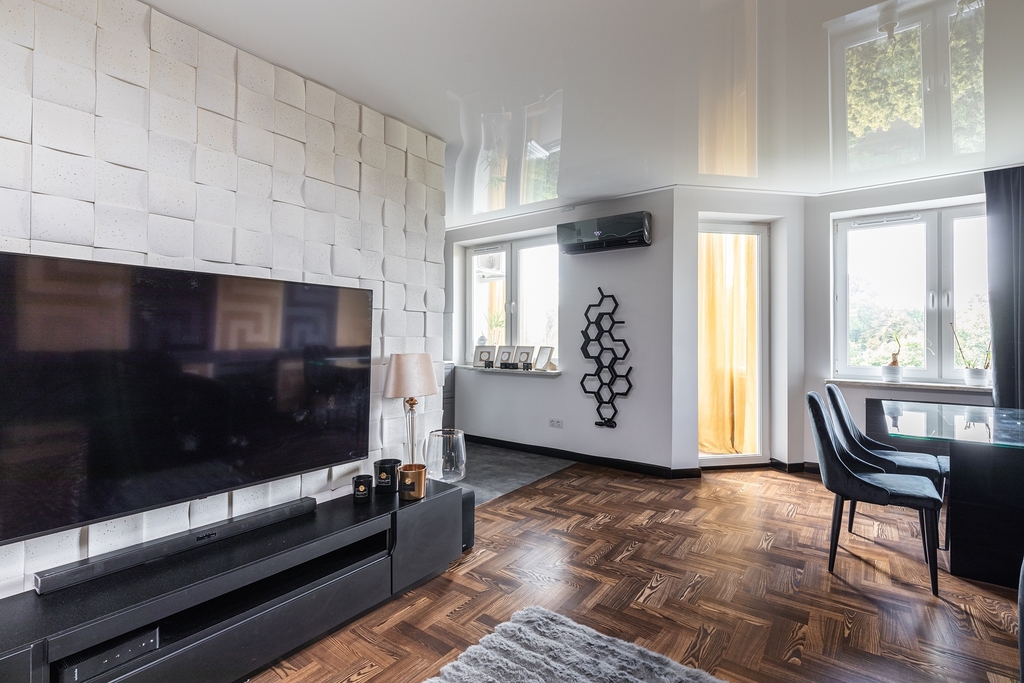 5. Za telewizorem ściana wyłożona nowoczesną mozaiką 15x15 cm