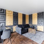 8. Elektryczny karnisz z zasłonami w dwóch kolorach (złoty i czarny) idealnie komponujący się z tapetami (sterowany pilotem)