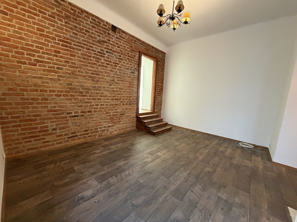 Układ pomieszczeń- Salon z aneksem kuchennym (25 m²) – przestronny, jasny, z oryginalną odsłoniętą cegłą