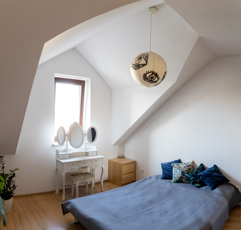 Każde z pomieszczeń ma swoje okno – kuchnia i antresola mają okna dachowe. Z salonu