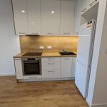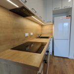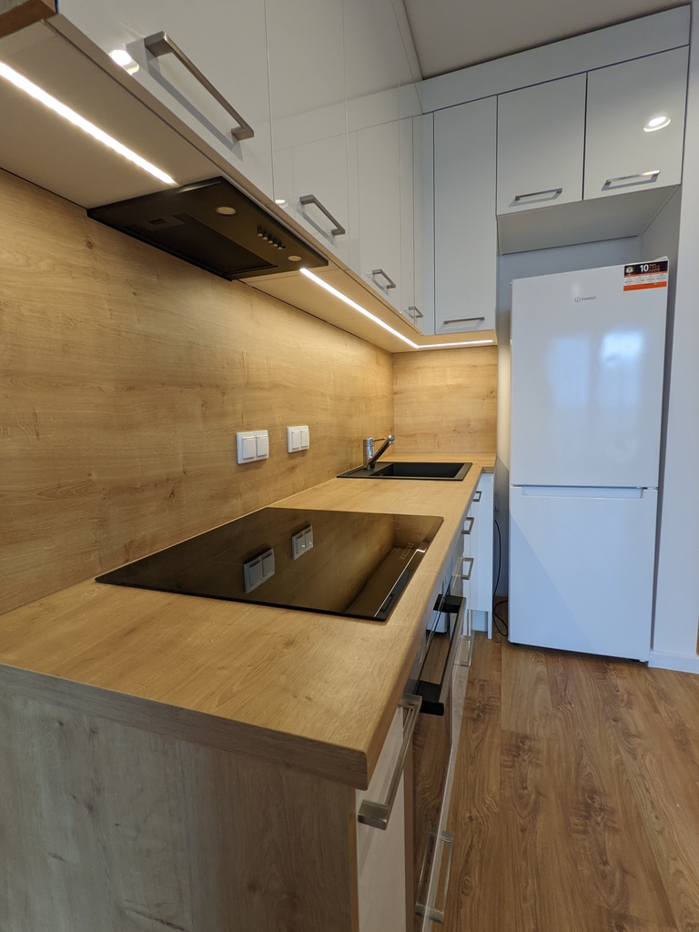 Pokoju z aneksem kuchennym (lodówka, zlewozmywak, piekarnik, płyta indukcyjna, kanapa, stolik kawowy, szafka pod telewizor) - 26,m2