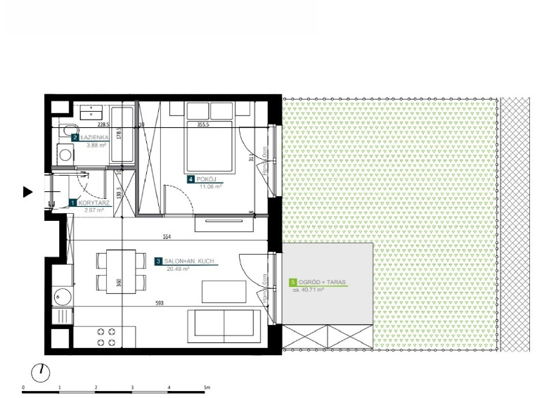 - Pokój  z aneksem kuchennym - 20,49 m2