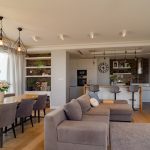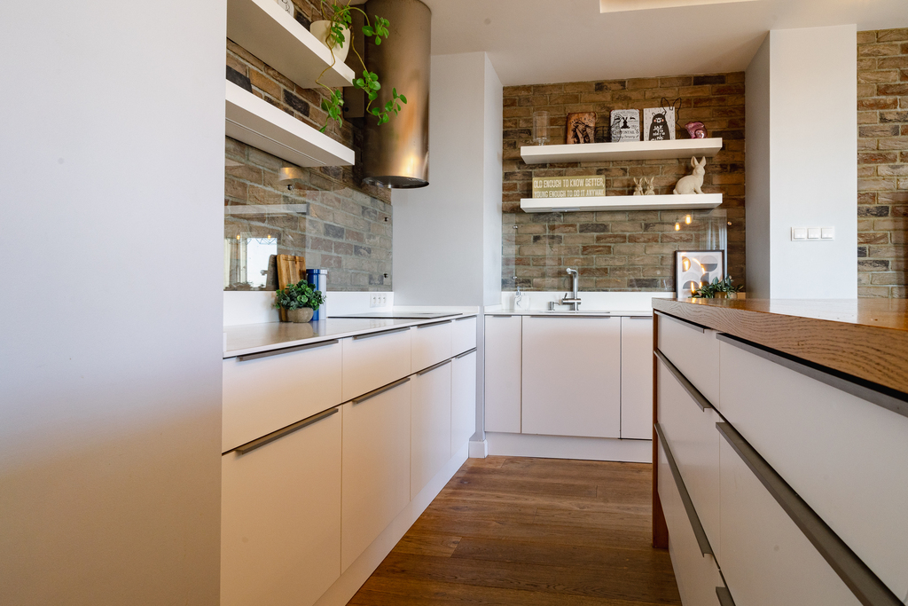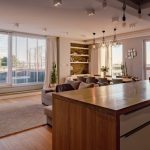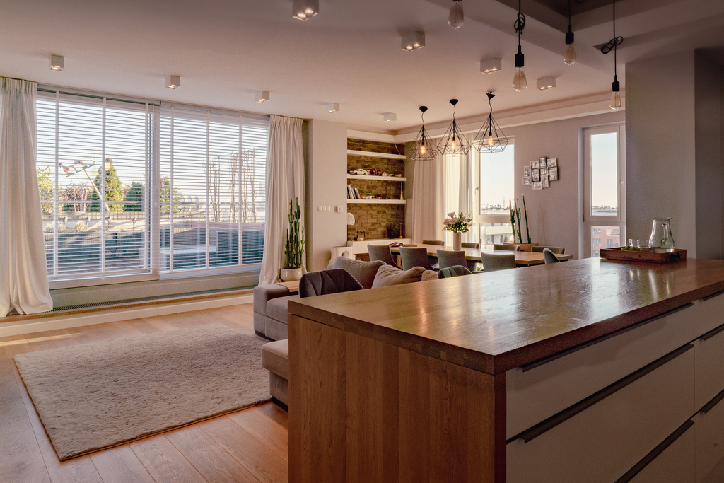 • Przestronny salon z aneksem kuchennym (ok 52m²) – duże, narożne przeszklenia zapewniają panoramiczny widok i wpuszczają mnóstwo naturalnego światła, optycznie powiększając przestrzeń. Dodatkowym przedłużeniem strefy dziennej jest wyjście na przestronny taras.