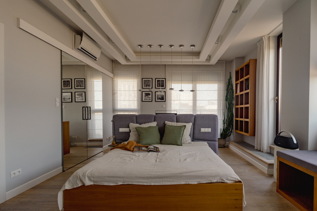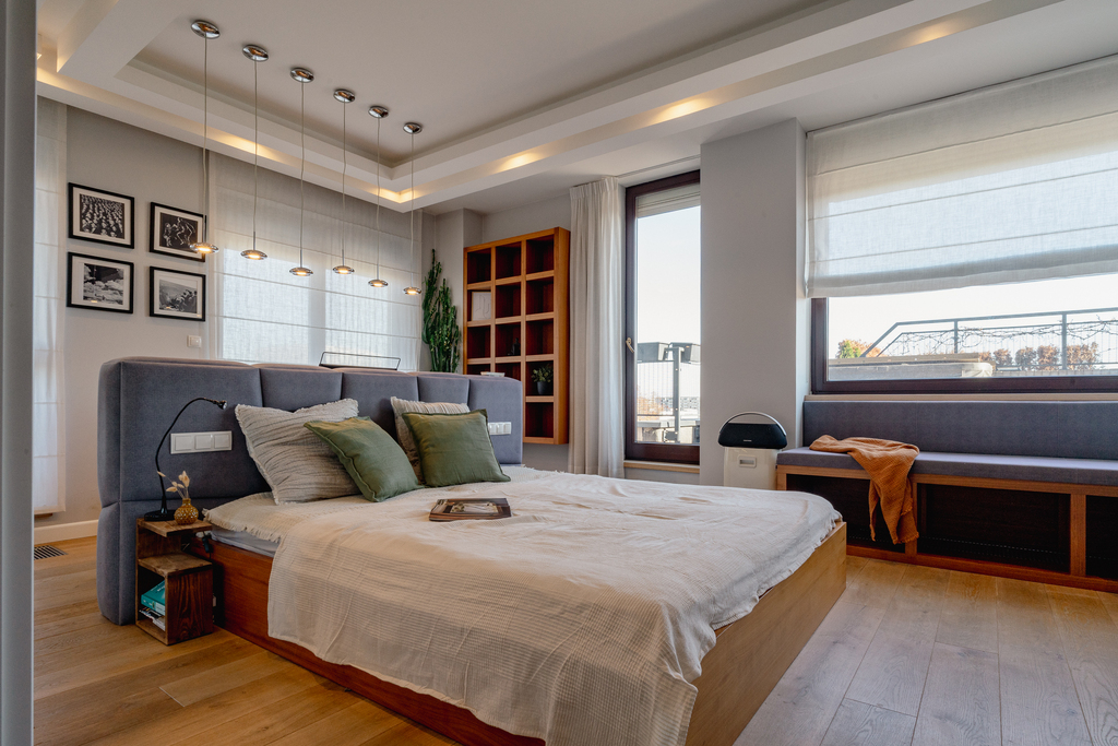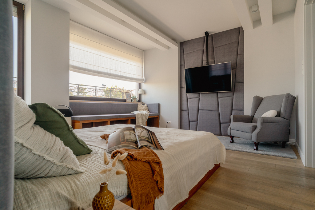 • Master Bedroom (ok.26m2) z wydzielonymi strefami, relaksu, odpoczynku oraz garderobą i osobnym wyjściem na taras
