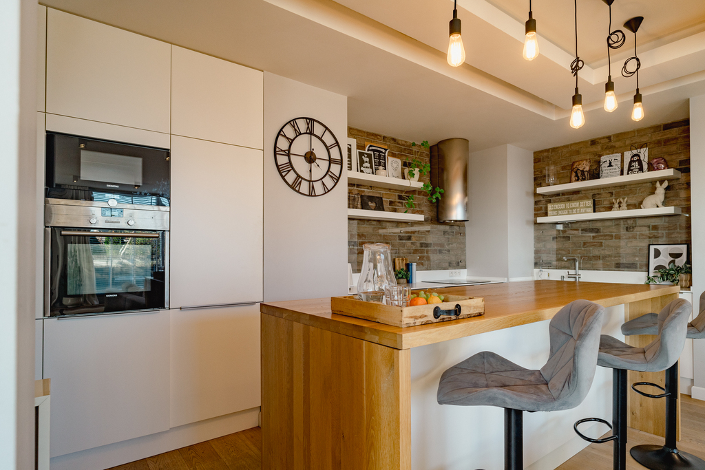 • Kuchnia w pełni wyposażona w sprzęty AGD, harmonijnie połączona z jadalnią z dużym stołem dla 10 osób. Dodatkowo spiżarnia 3m2, dzięki której łatwo utrzymać porządek w przestrzeni dziennej.