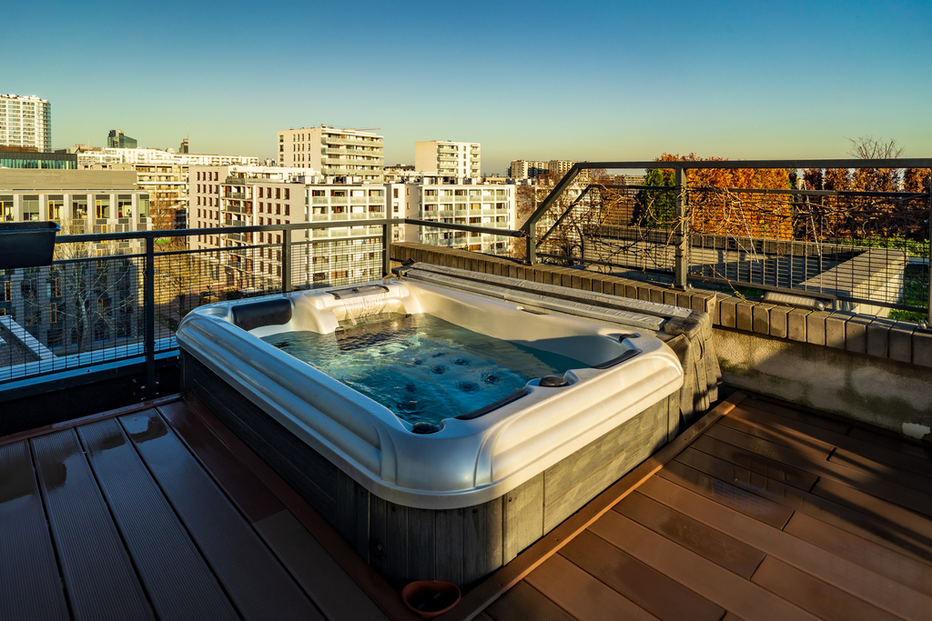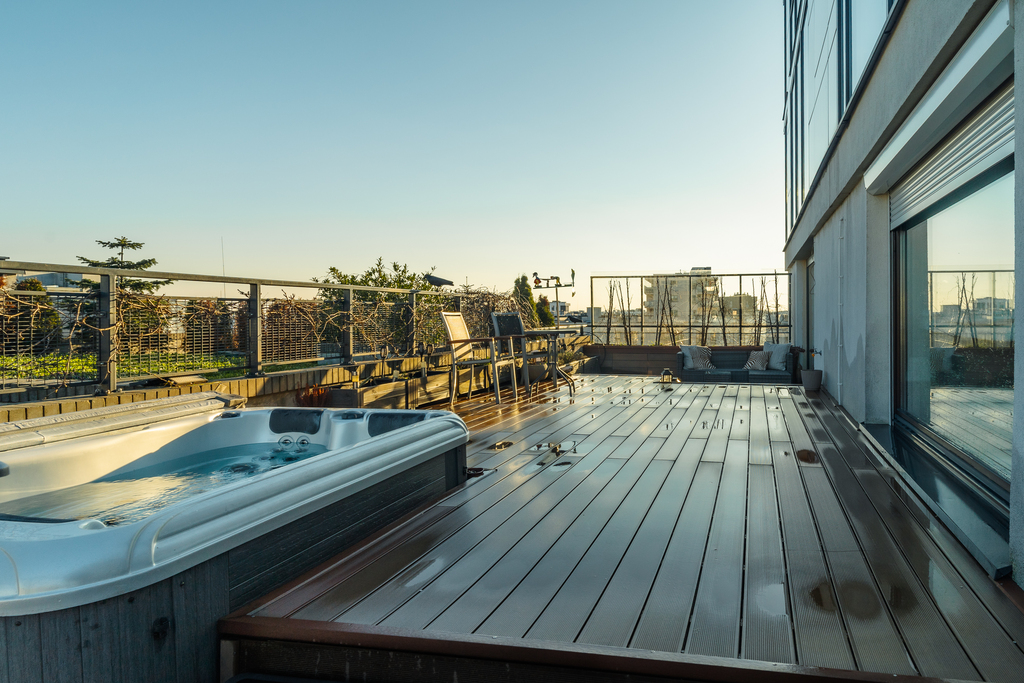 • Taras 120 m² z jacuzzi - miejscem relaksu i odpoczynku