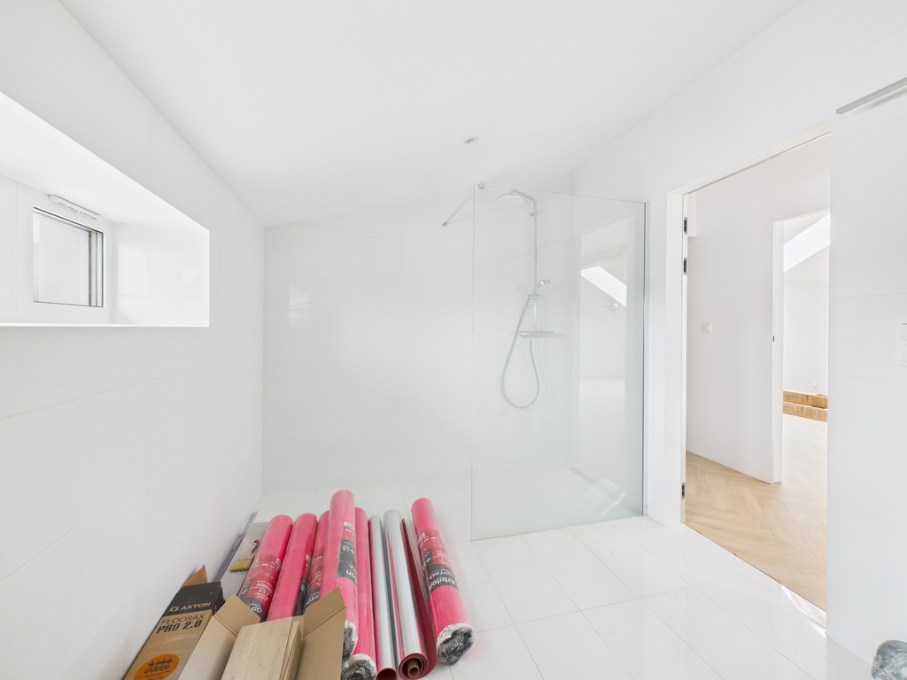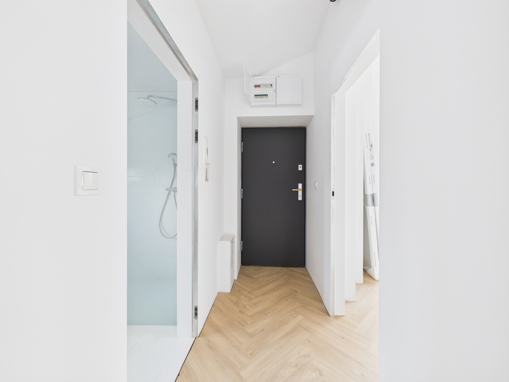 Apartament jest w trkacie wykończania pod klucz. Na podłogach położone są panele, w łazieńce kafle, a w aneksie kuchennym zamontowana została abudowa meblowa, w której znajdzie się część sprzętu AGD (bez lodówki). W łazience zamontowana jest duża prysznic typu walk in, toaleta i pojawi się również szafka z umywalką.