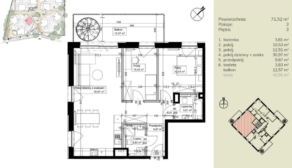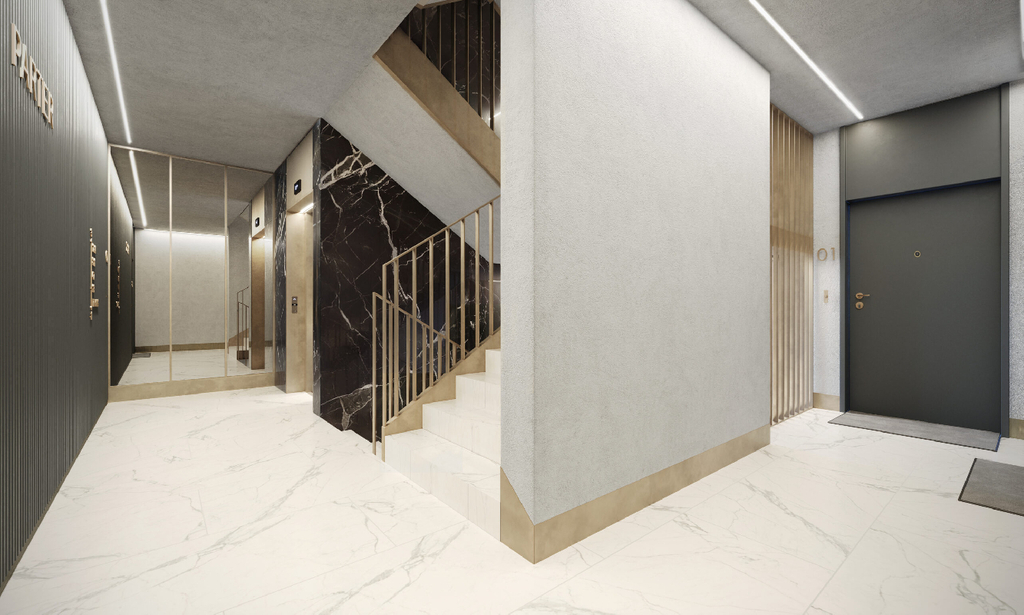 Luksusowy apartament o powierzchni 71,61 m2 z balkonem i tarasem na dachu, zlokalizowany na trzecim ostatnim piętrze nowopowstałego budynku apartamentowego.