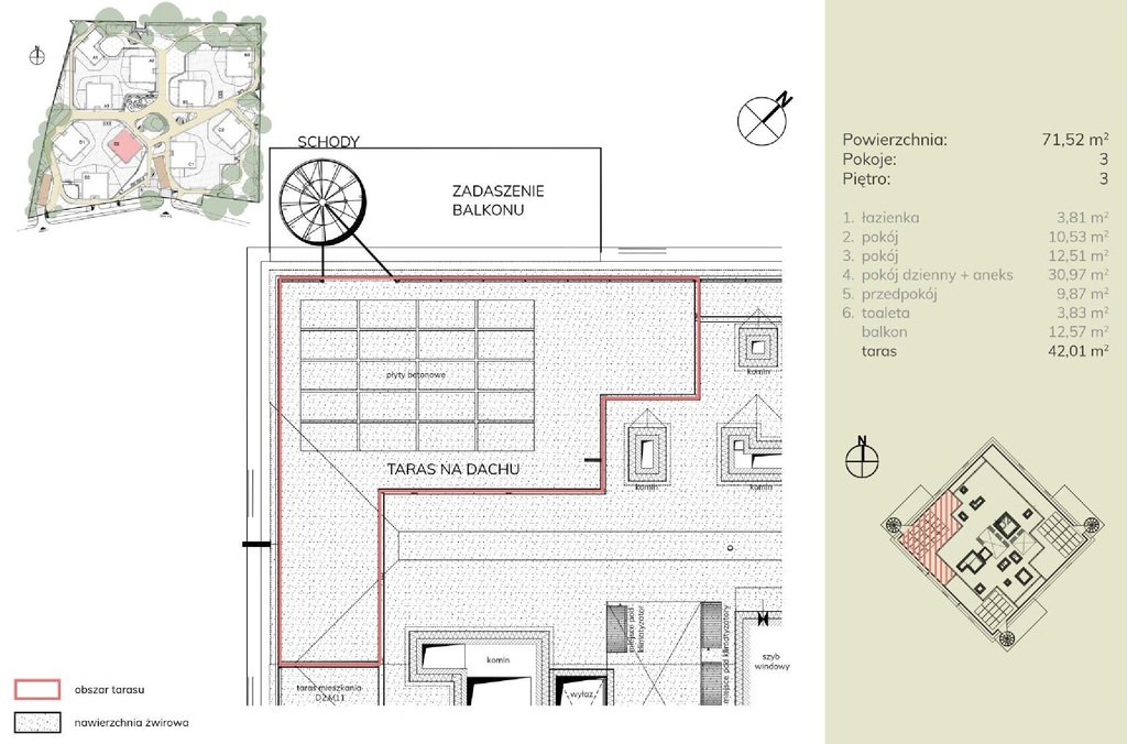 Do mieszkania przynależy balkon o powierzchni 12,57 m2 oraz taras na dachu budynku o powierzchni 42,01 m2.