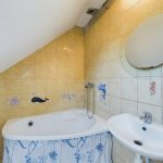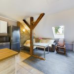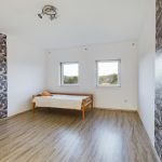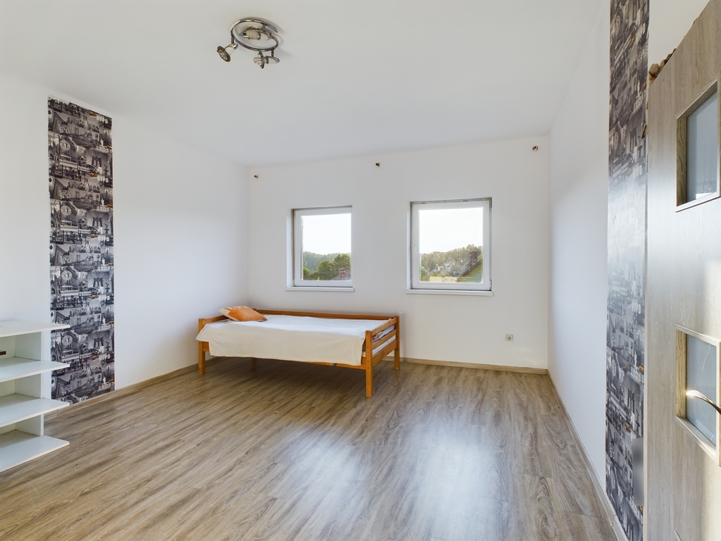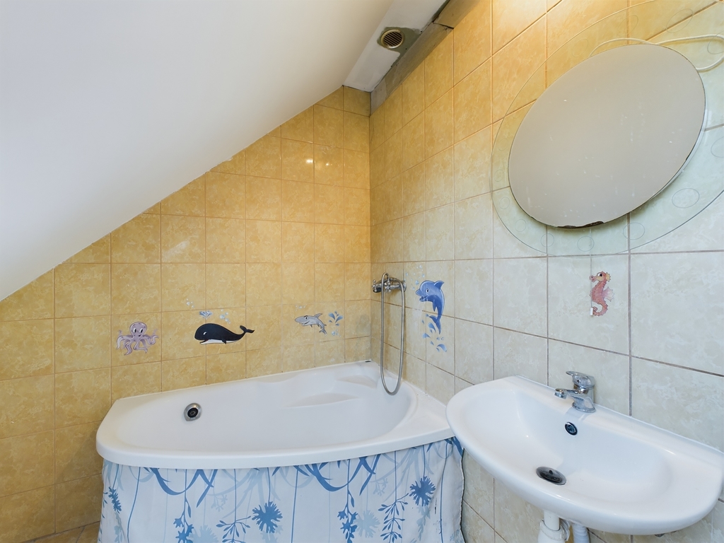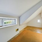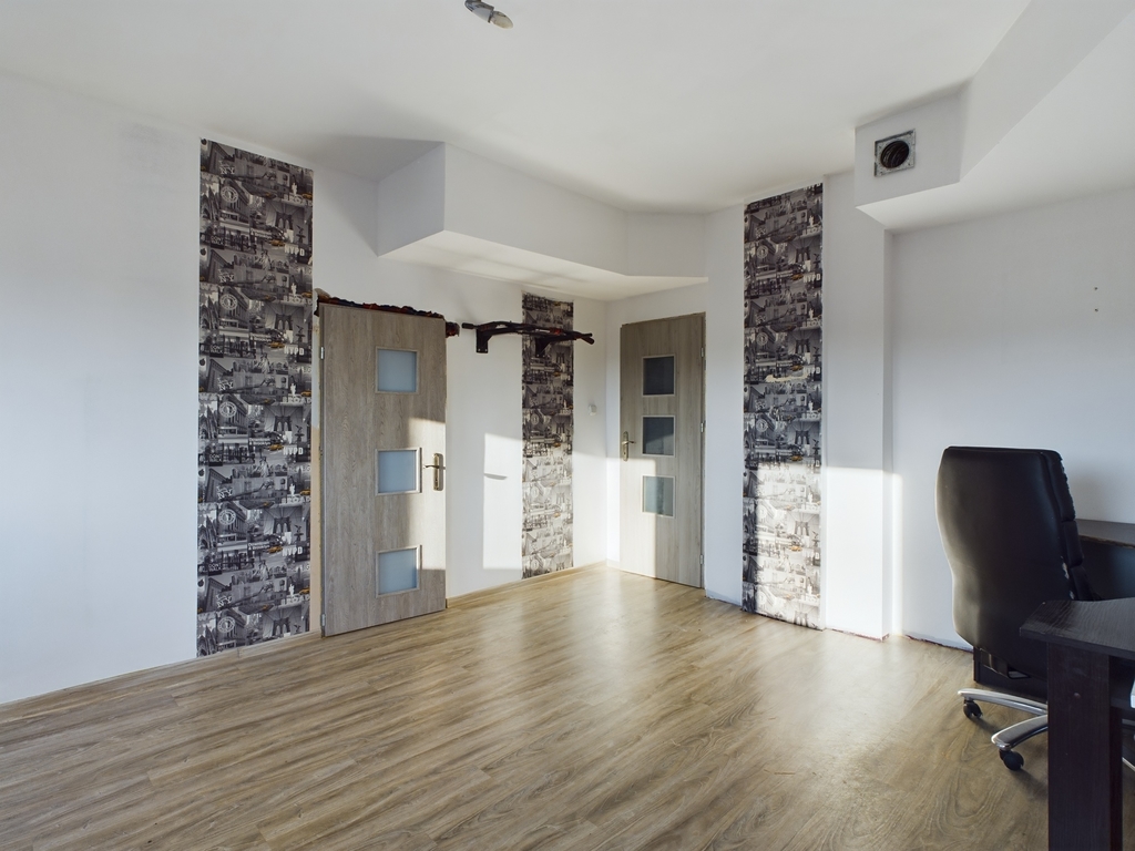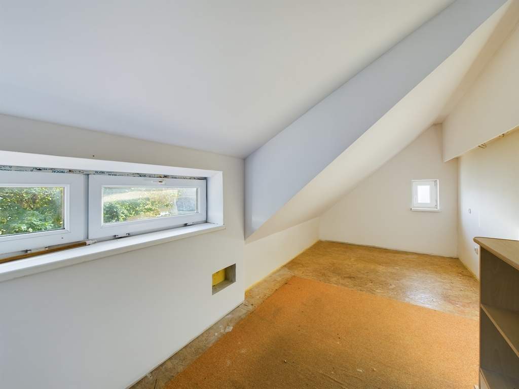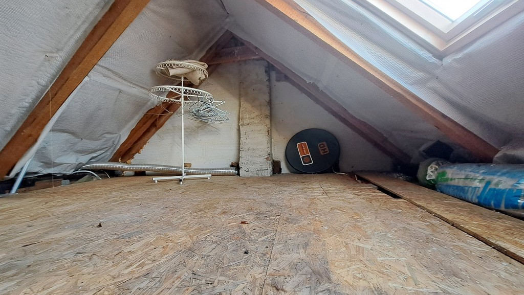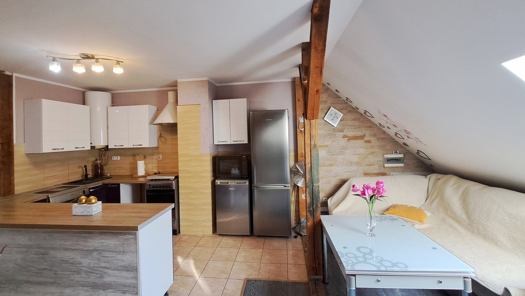Okna PCV oraz połaciowe, na podłogach panele i terakota.