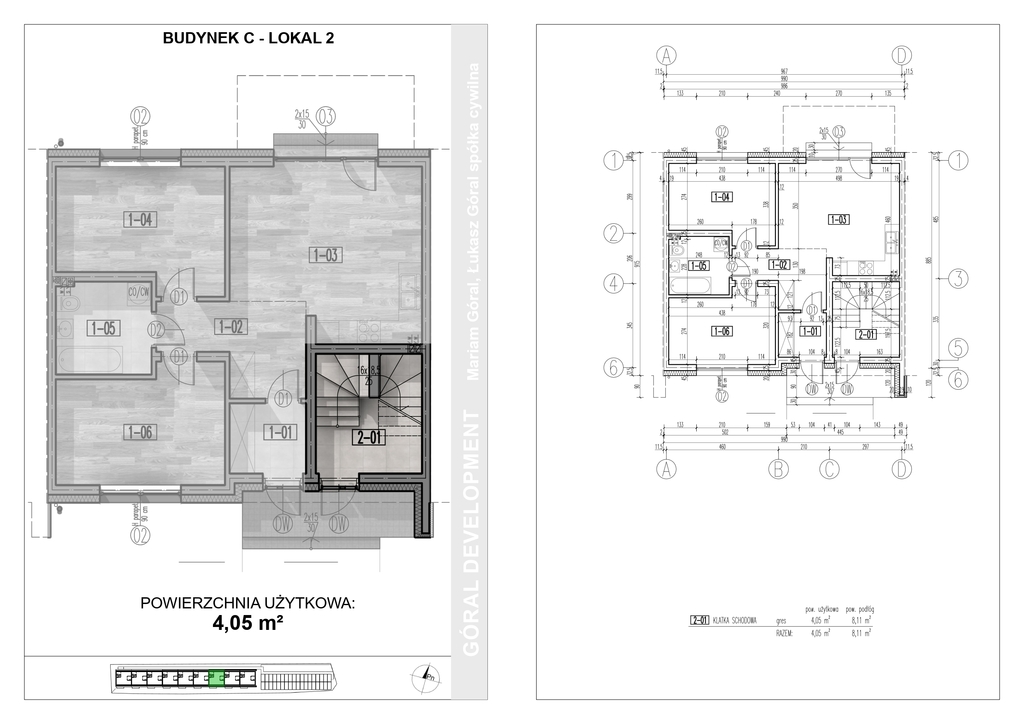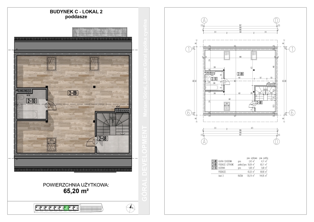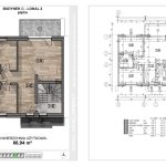 prywatny ogródek – około 50 m2, 2 miejsca postojowe Dwupoziomowy ok. 136,19 m² Układ pomieszczeń piętro: 2 pokoje, salon z aneksem, łazienka;