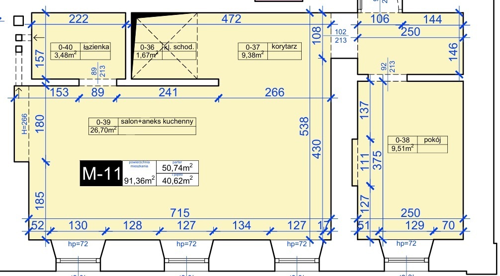- 50,74 m² salon z aneksem, pokój, łazienka