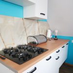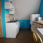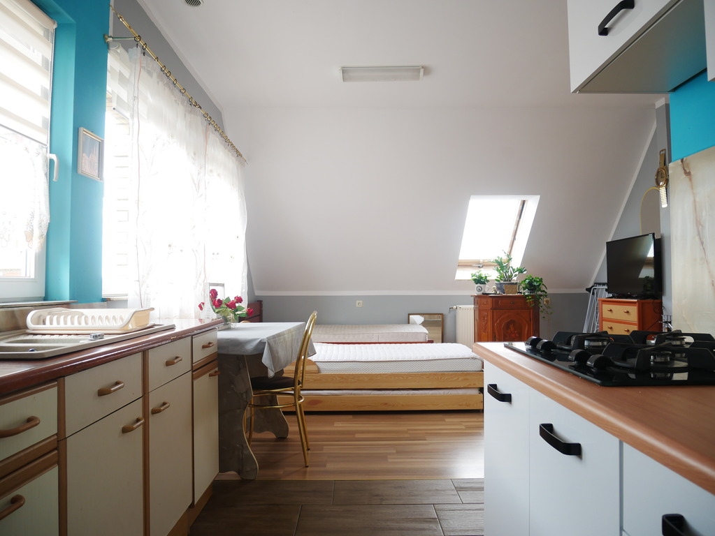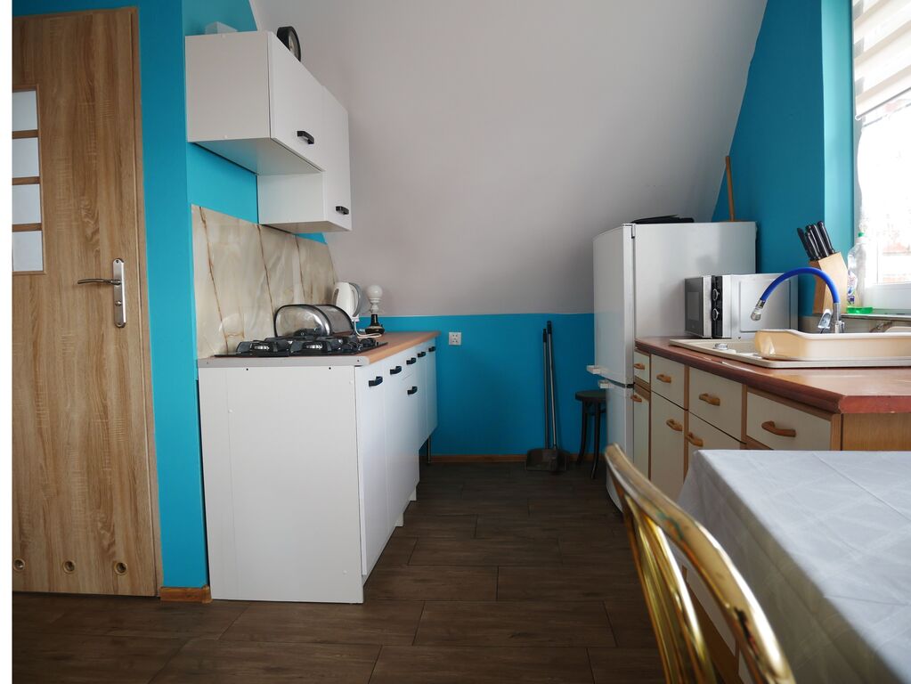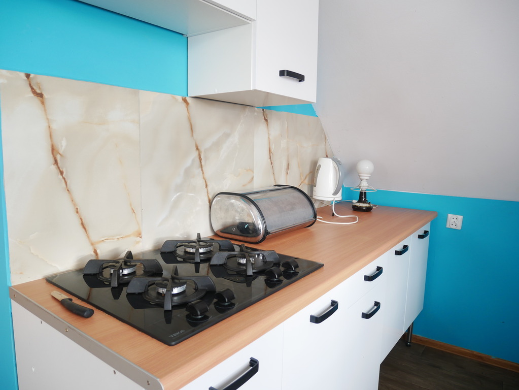 - Kuchnia: w pełni wyposażona w płytę gazową, lodówkę, mikrofalę