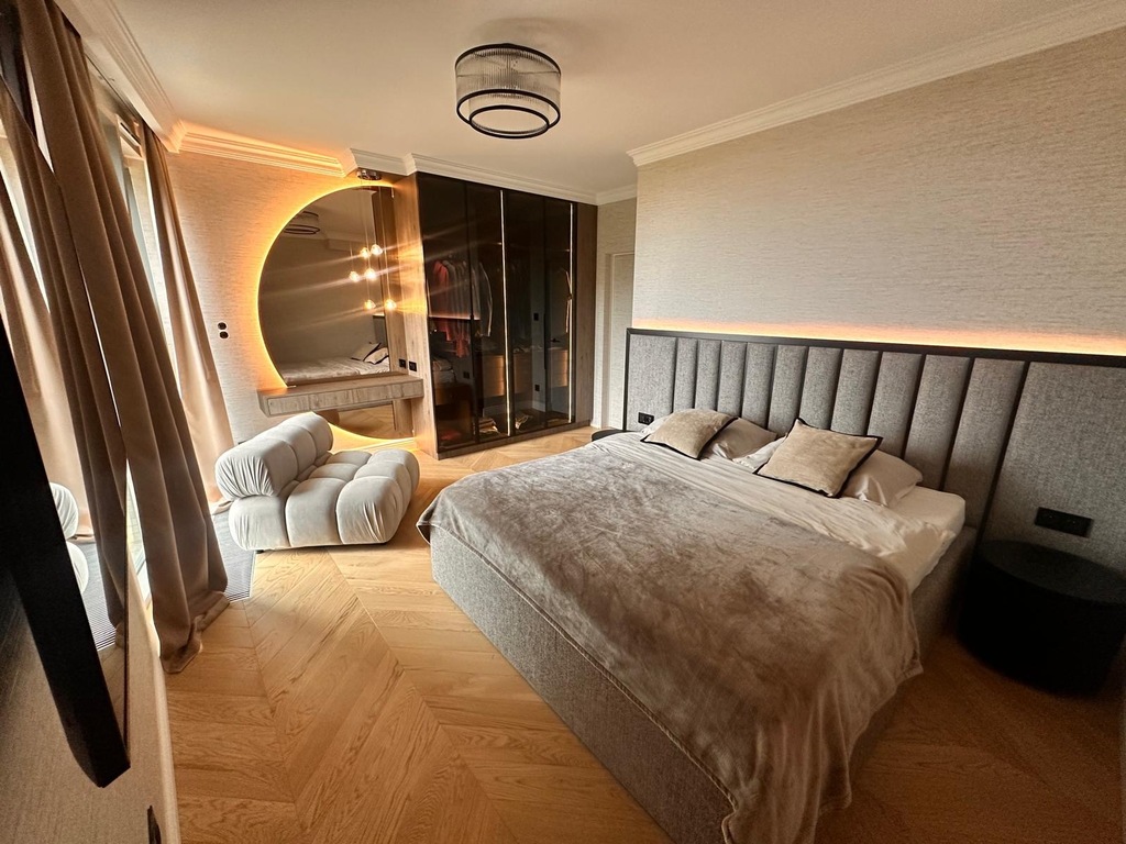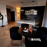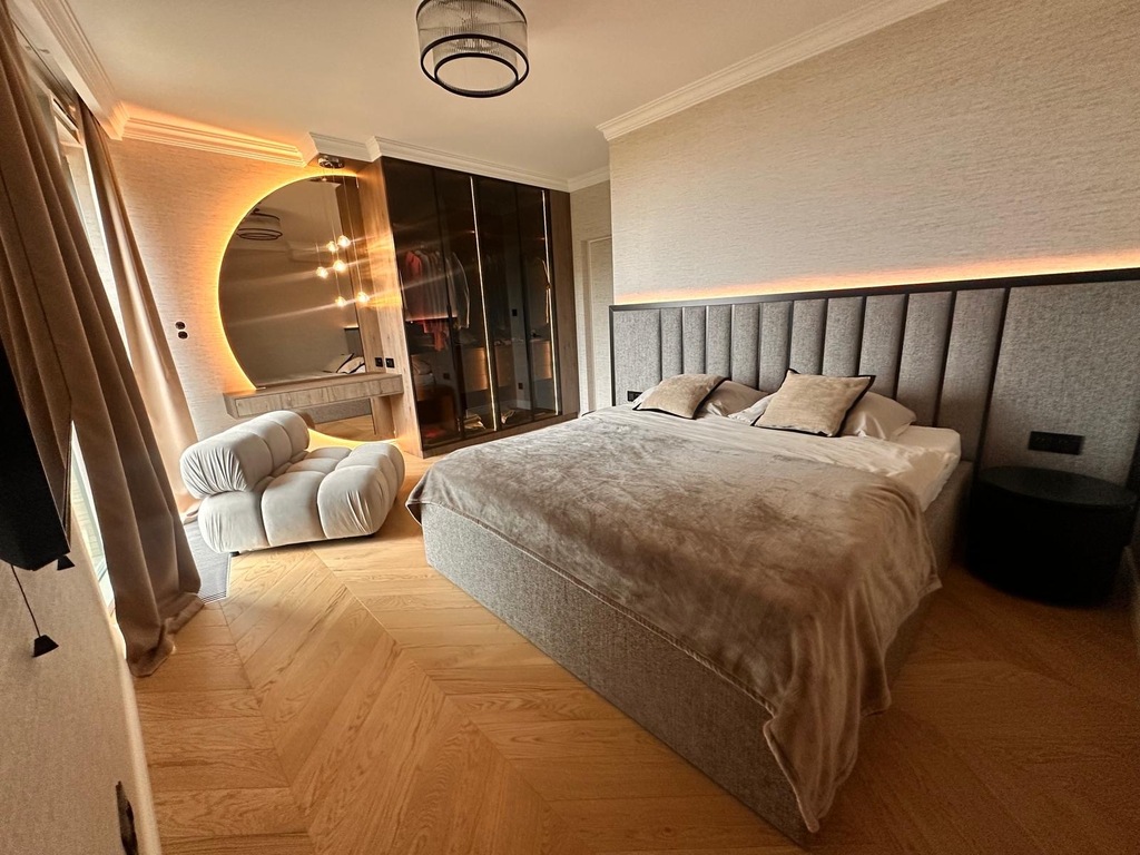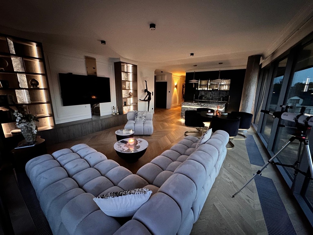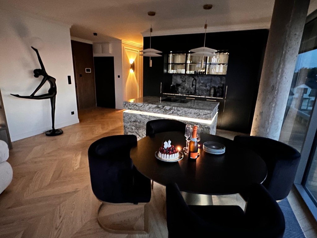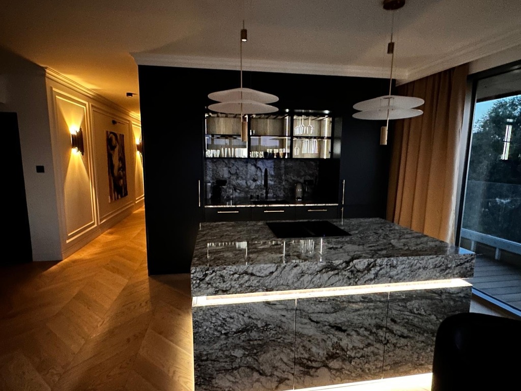 STANDARD WYKOŃCZENIAApartament został zaprojektowany z dbałością o każdy detal. We wnętrzu dominują naturalny kamień, drewniana podłoga w jodełkę, zabudowy stolarskie na wymiar oraz klimatyczne, wielostrefowe oświetlenie.