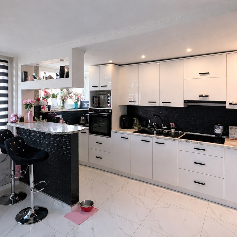 - kuchnia wyposażona jest w zabudowę meblową, co zapewnia funkcjonalność i wygodę użytkowania.