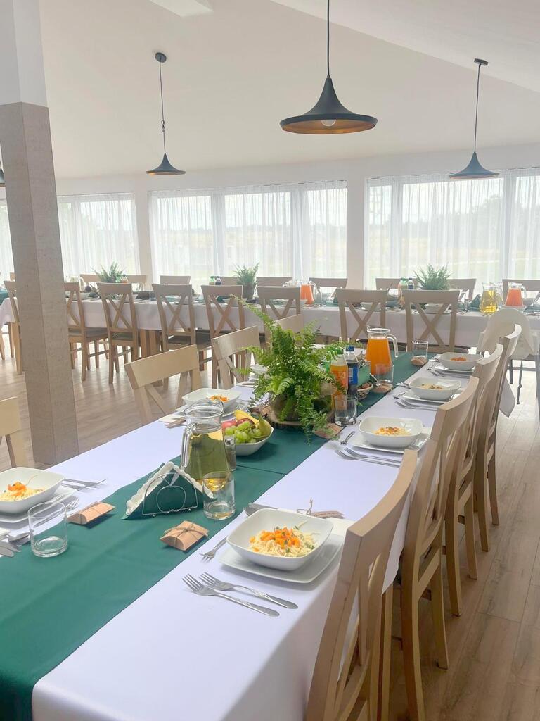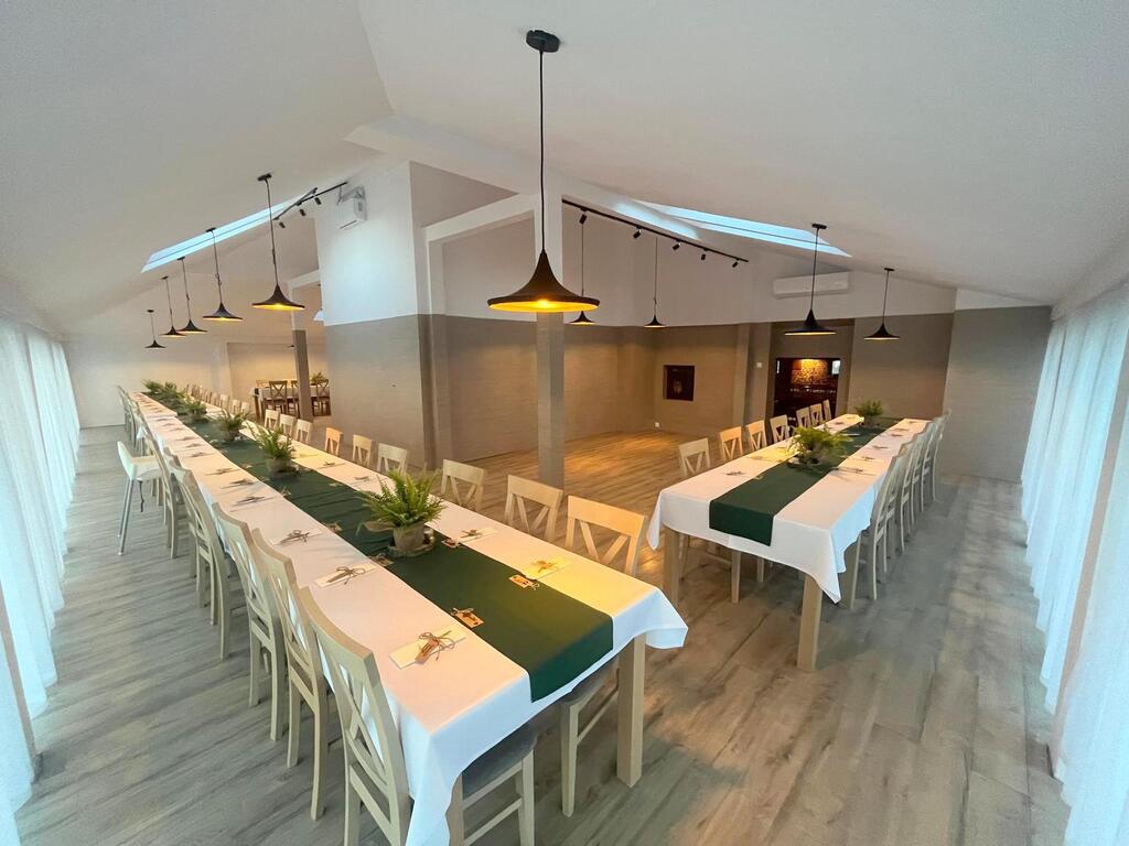 Lokal posiada dwie sale weselne, 3 łazienki dostępne dla gości weselnych, 5 pokoi noclegowych znajdujące się na piętrze budynku z niezależna łazienką.