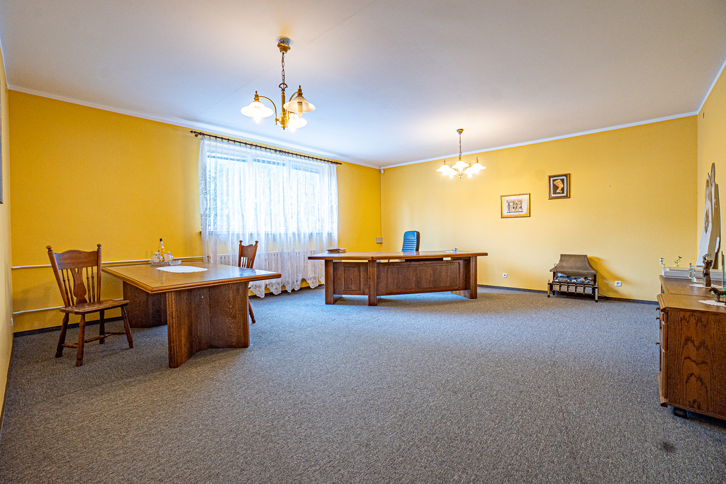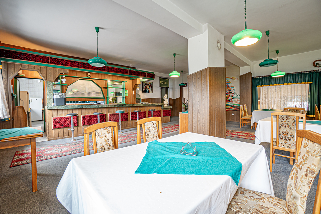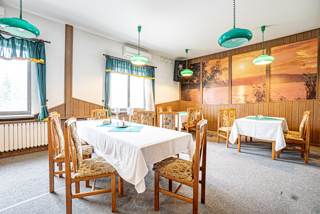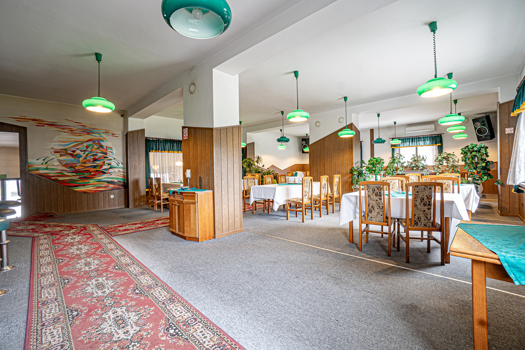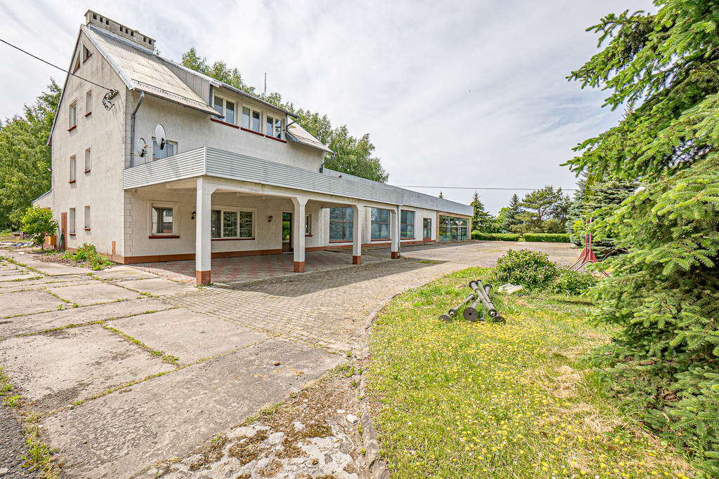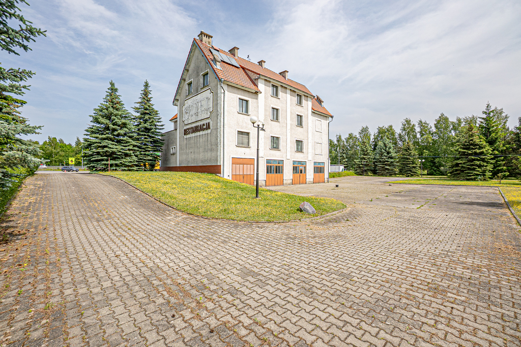 - Grunt obecnie zabudowany obiektem hotelowo restauracyjnym o powierzchni użytkowej 817,3 m2 składającym się z sali restauracyjnej, kuchni z zapleczem, 10 pokoi z łazienkami, warsztatu. Budynek mieszkalny składa się z pomieszczeń mieszkalnych hal weselno-restauracyjnych z zapleczem biurowym i socjalnym o łącznej powierzchni użytkowej 1981 m2.