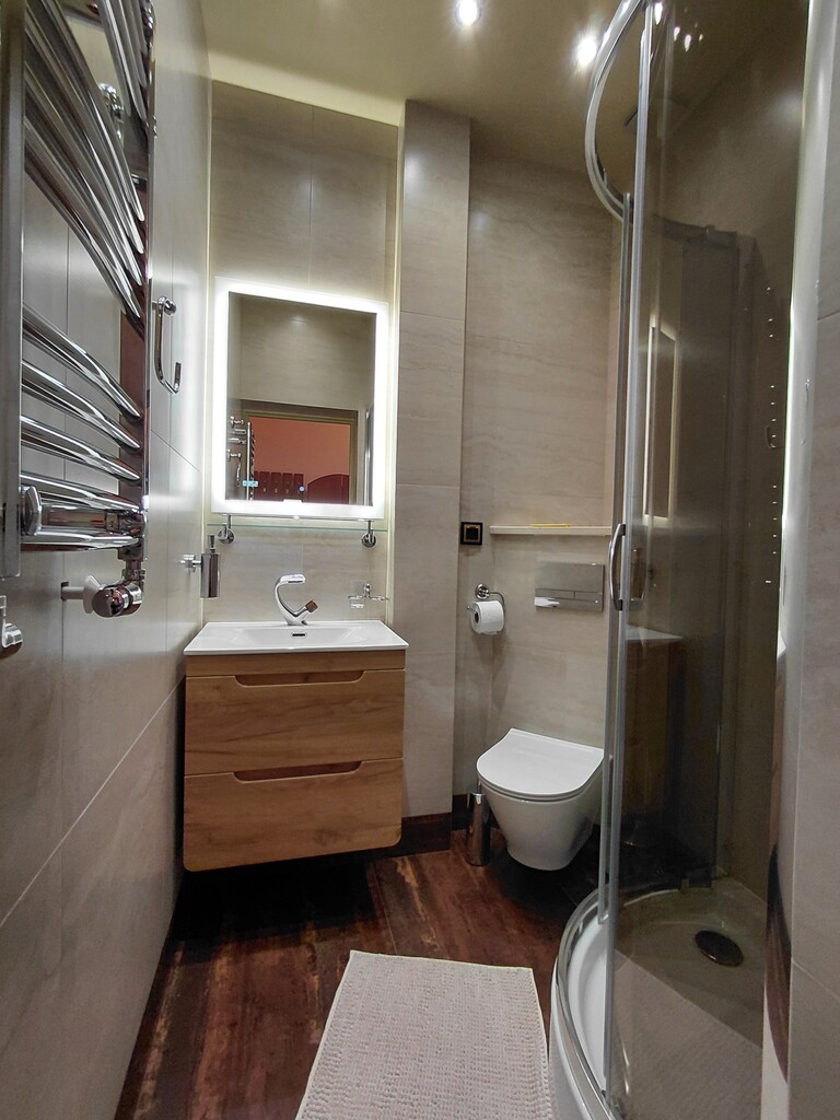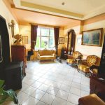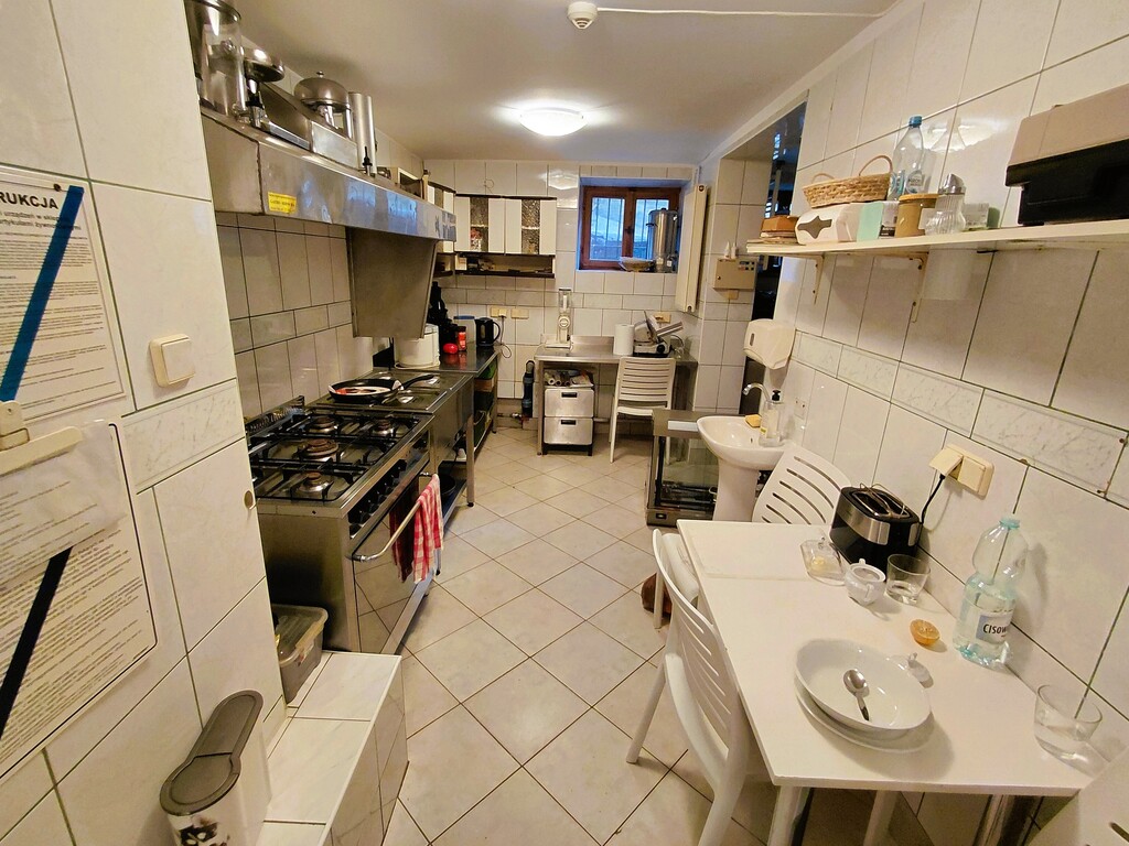 - Na parterze przestrony hol z recepcją, dwie toalety, mieszkanie dwupokojowe z łazienką i aneksem kuchennym oraz jadalnia, która może pełnić również funkcję dwupokojowego mieszkania z łazienką i aneksem kuchennym.