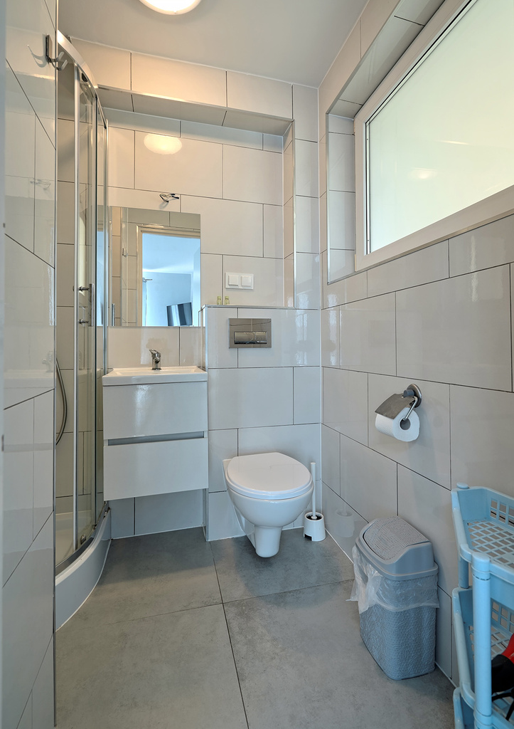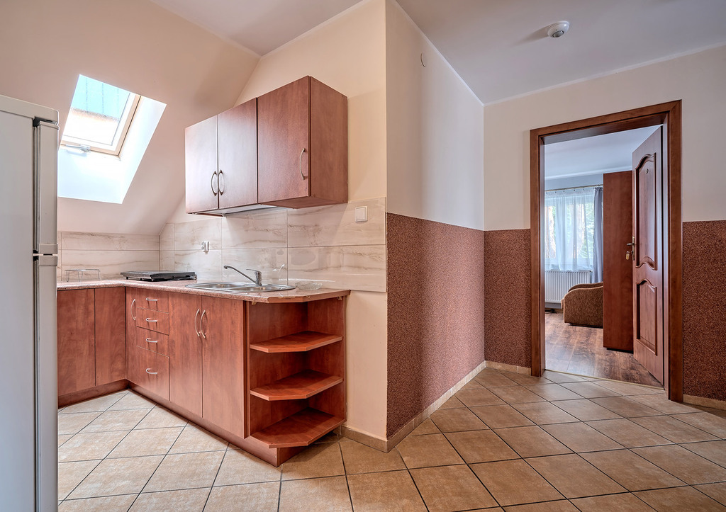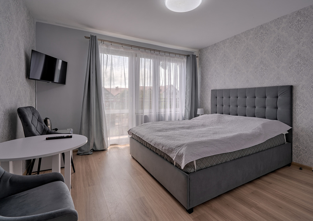 - w obu budynkach znajduje się łącznie 17 przestronnych pokoi dla gości (łącznie 41 miejsc noclegowych), w tym 2 pokoje typu studio (dwupoziomowe), większa część pokoi (12) posiada balkon. Każdy pokój posiada własną łazienkę. Wszystkie pokoje wyposażone są w łózka małżeńskie lub tapczany, szafę na ubrania, stolik, foteliki, lodówki, TV